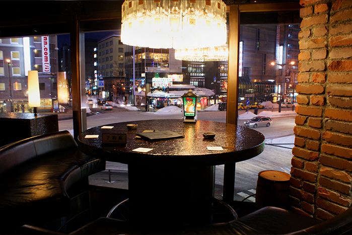 「すすきの」交差点を眺めることができる円卓には、ニッカウイスキーのボトルでこの席のために作成されたオリジナルのシャンデリアが高級感を演出。